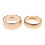 FIVE 9ct stamped gold wedding bands with one pinky signet ring engraved M largest ring size R(engraved inside ring), 3 P size and the smaller one size G, combined weight, 14.50g approx