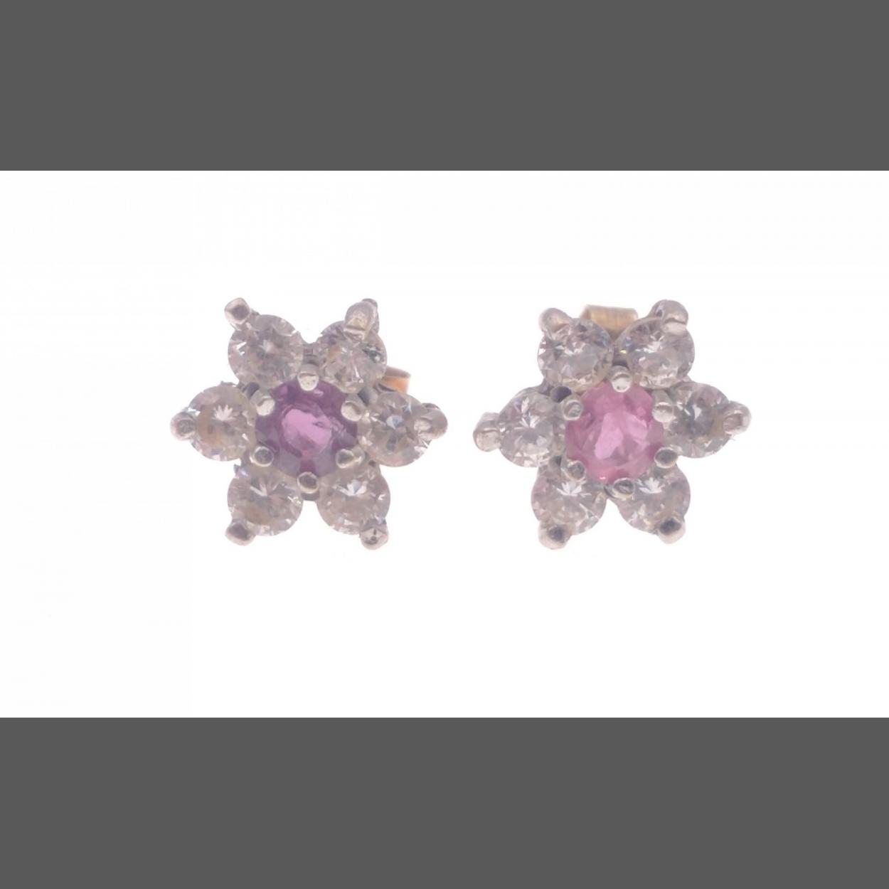 9ct stamped yellow gold stud earrings with diamond effect and a small garnet centred in flower form - gross weight 1.22g approx