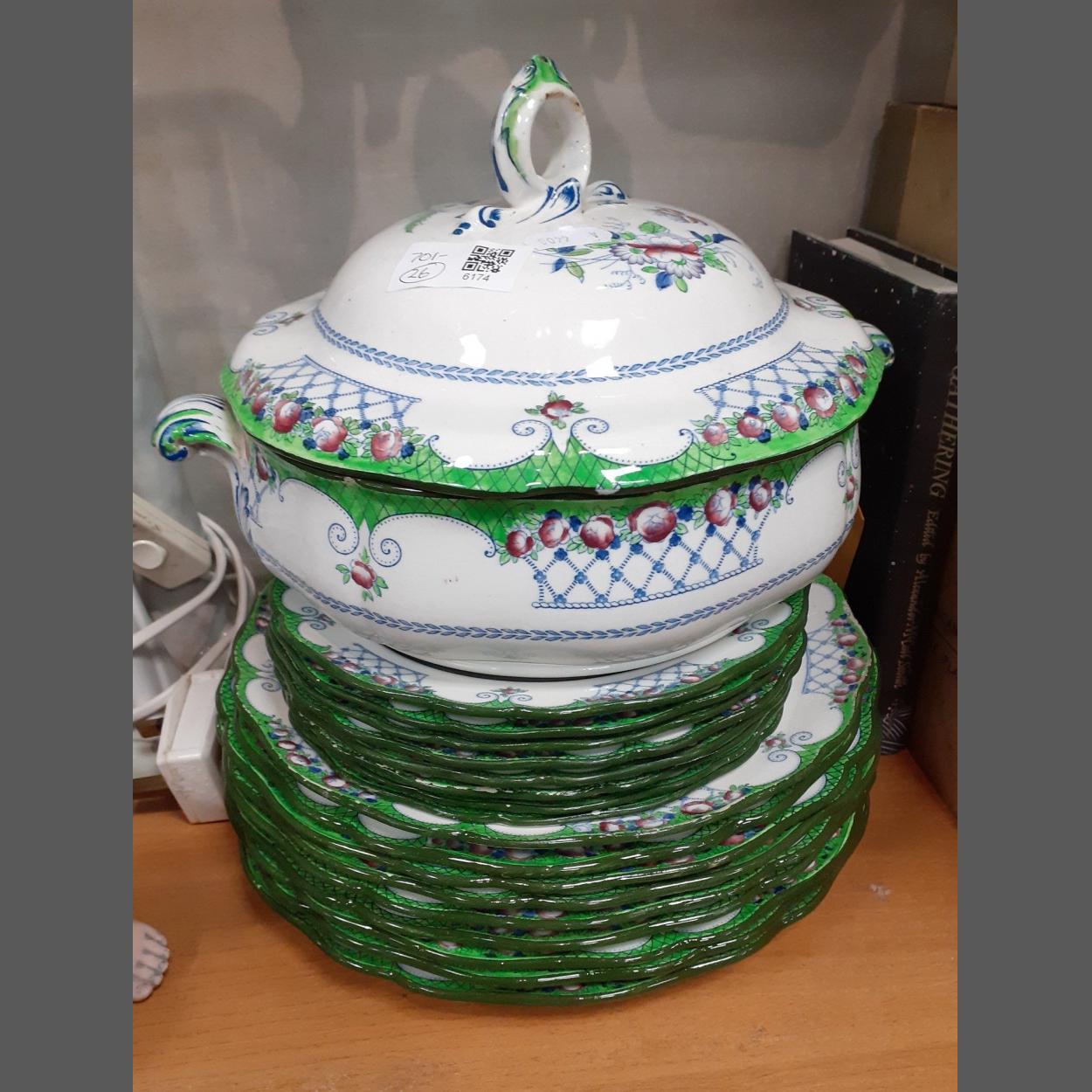 A vintage part ROYAL DOULTON dinner service in CORO pattern (D3735) to include 8 plates (19cm), 2 plates (24cm) and 7 plates (26cm) and 1 lidded dish (20cm dia), some slight wear to edges of plates but generally good condition for their age