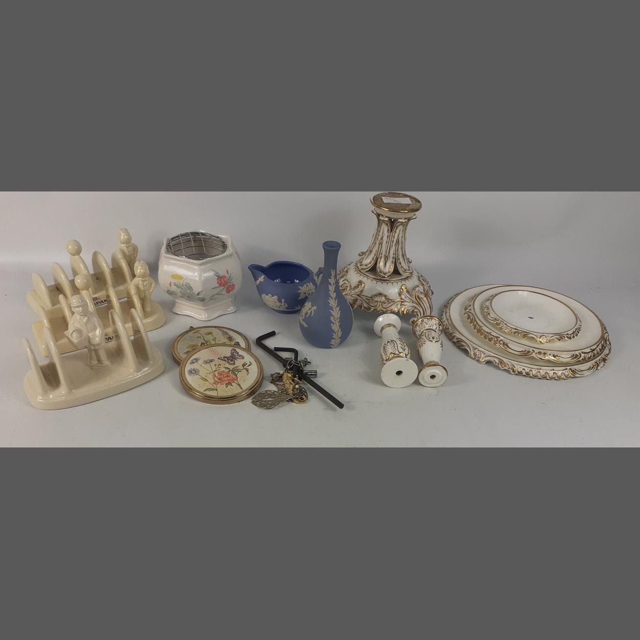 A mixed box of mostly ceramic items to include a three TIER CAKE STAND missing the handle , WADE TOASTRACKS one with a chip and unusual WEDGWOOD JASPER jug
