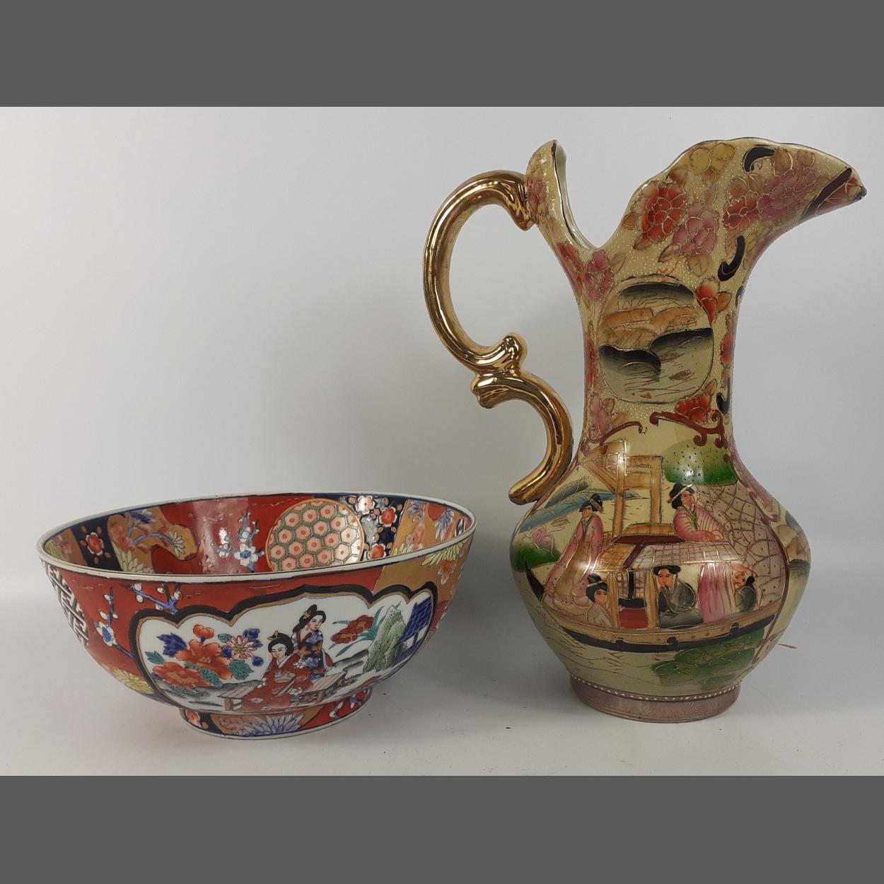 Two modern eye catching ORIENTAL Ceramic items a large 34cm gilt handled jug decorated with boating scenes and a 26cm diameter VIBRANT bowl , the bowl has crack to the rim