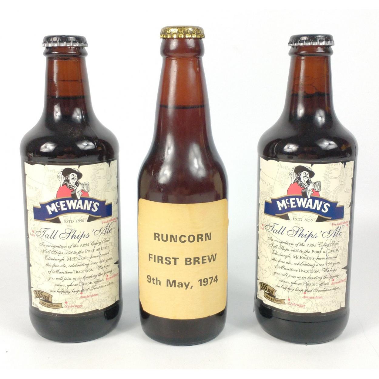 Three vintage bottles of beer, two McEWAN'S Tall Ship's Ale (best before December 1995) and an even older bottle of RUNCORN FIRST BREW dated 9th May 1974, anyone's birthday? These bottles are for collecting only and NOT FOR CONSUMPTION. The item is sold as described and we do not accept liability for the state of the closure or the taste of the contents.