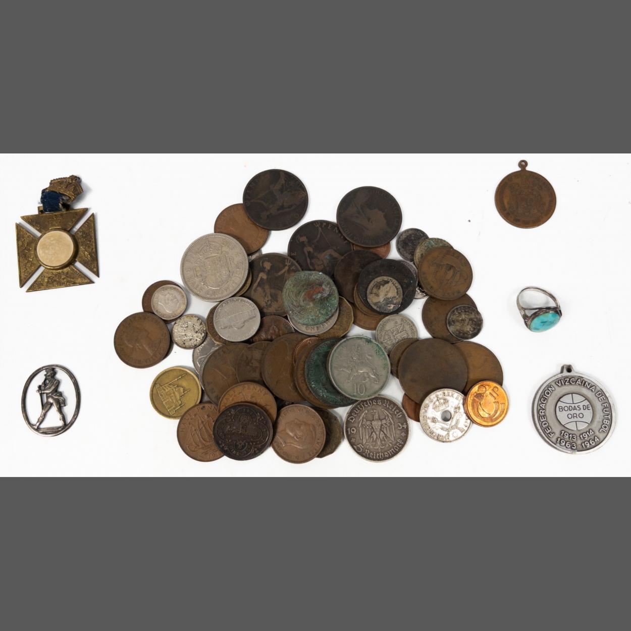 A right old mixture to include what looks like a JOHNNY WALKER(of KILMARNOCK) white metal pendant 3.5cm length, also a QUEEN VICTORIA commemorative medallion with part ribbon and crown a-top 6cm height approx, also a BODOS DE ORO medallion, and lastly a commemorative medallion with the Royal Visit To Glasgow by Edward Vll and Alexandra 1903 and a collection of old mainly British coinage plus a nice silver 925 stamped with oval turquoise style stone size L etc