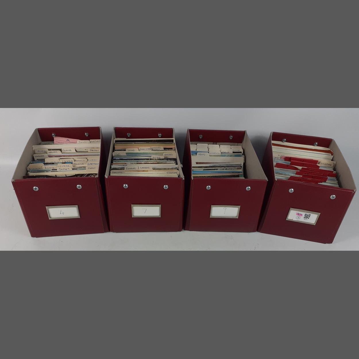Four boxes of modern postcards, sorted into categories with dividers in maroon storage boxes.