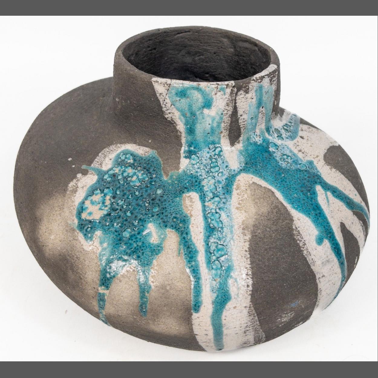 An unusual STUDIO POTTERY vase in black with a white and teal splash decoration, stands approx 13cm high, approx 20cm wide at base