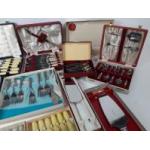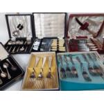 A box containing a substantial quantity of cased flatware including teaspoons, knives, cake slice etc. Also a box containing two Bohemia crystal. 15 items in total.