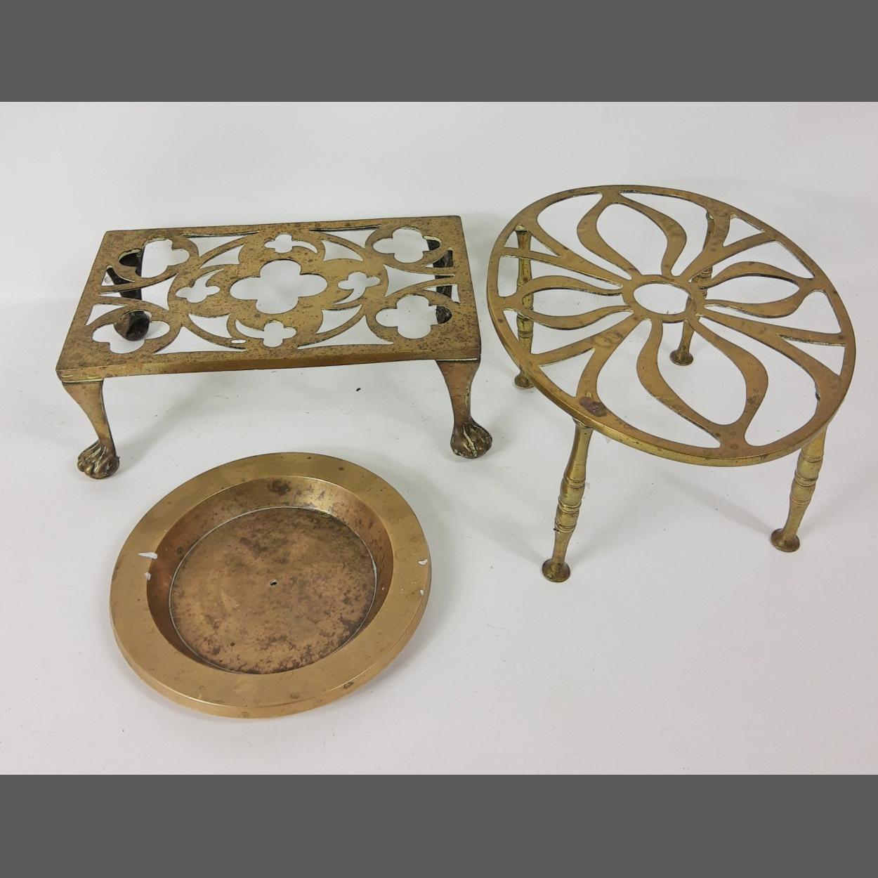 Three brass items, to include two trivets and a pot holder - 18cm approx.