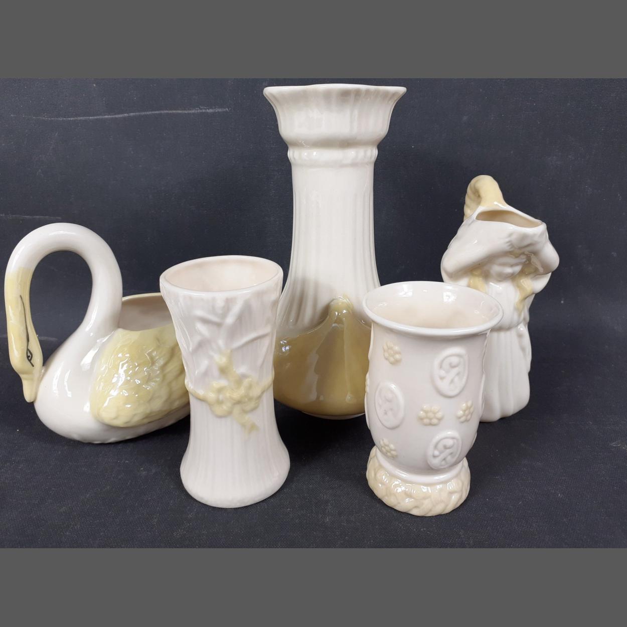 Five pieces of BELLEEK fine china including 3 vases 17cm and 10cm high plus a small jug 13cm high, and a swan-shaped dish approx 14cm long and 11cm high
