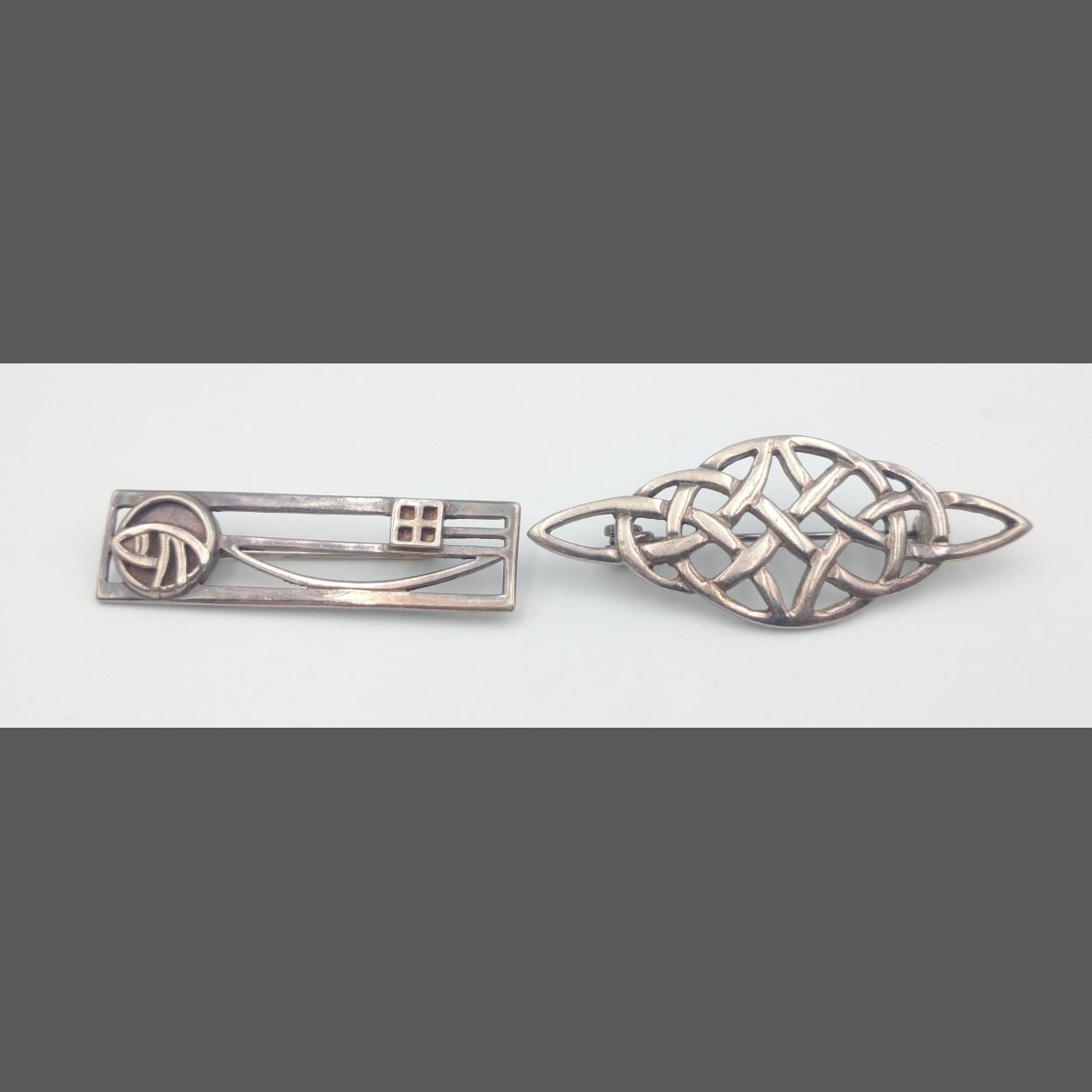 TWO 925 stamped silver brooches to include a CELTIC design one length 5cm length, and a CHARLES RENNIE MACKINTOSH inspired oblong pin brooch 4cm length 9.15g weight