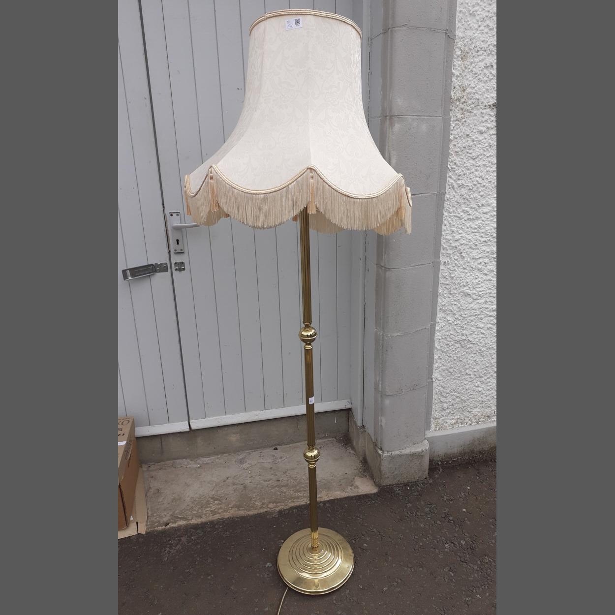 Large metal floor lamp with cream brocade style fringed shade. Stands 170cm high approx.