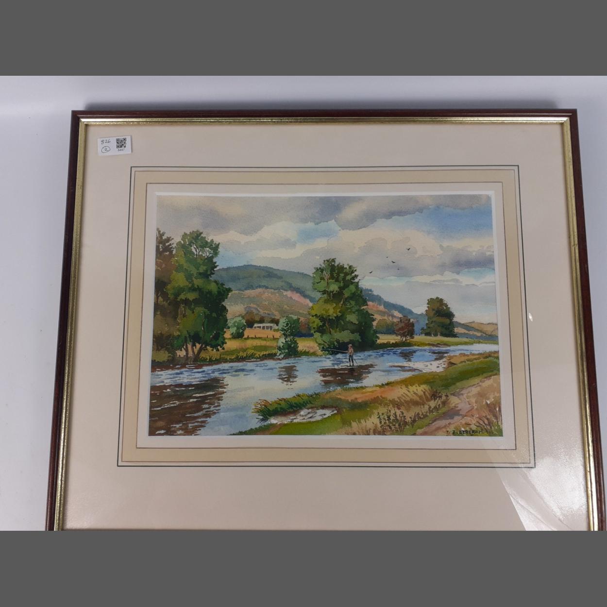 T.J.BERTRAM - Local Border artist. Original water colour dated 1994 and reputedly commissioned by request from the original owner who was a keen fisher man. Depicts a fisherman in the River Tweed at innerleithen. 58 x 48 cm approx including frame, actual art work size 38 x 27cm approx.