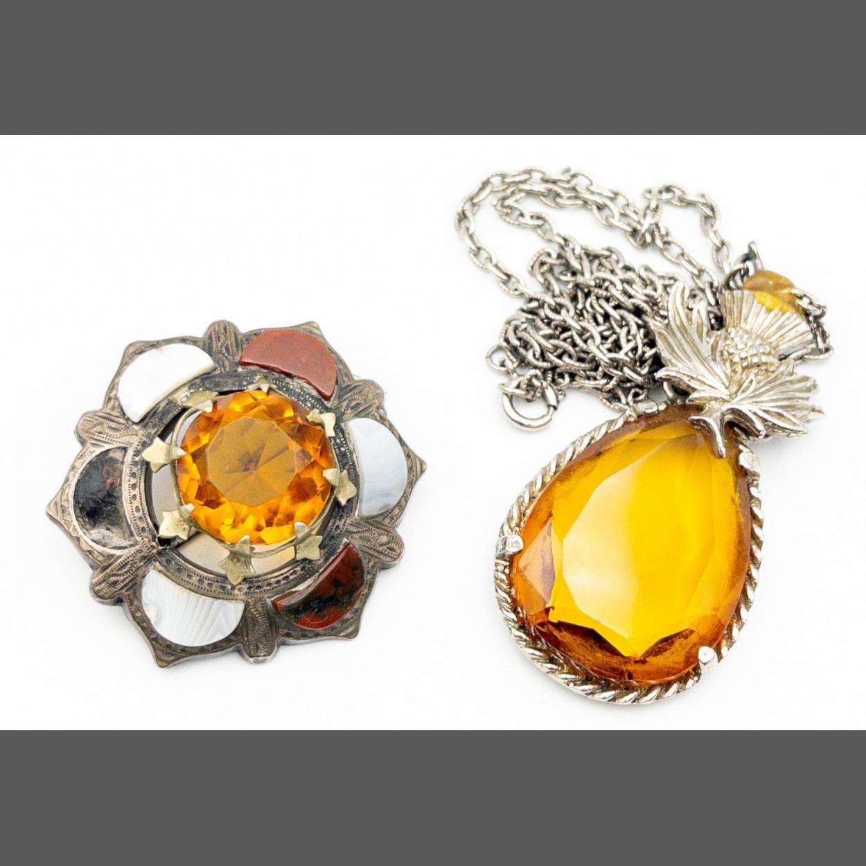 Two nice pieces of SCOTTISH jewellery, one chain and pendant in thistle form with with a large tear drop amber style stone, the other piece a brooch with amber style stone with coloured agate stones(one stone missing)