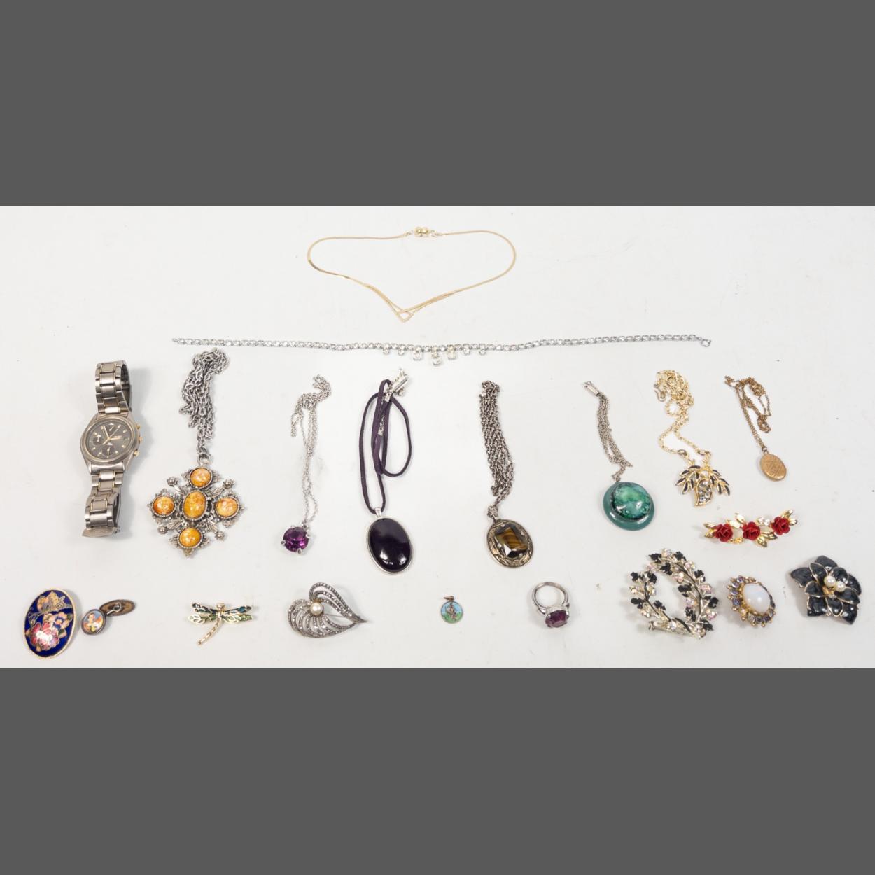 A bag of costume jewellery to contain a mixture of brooches, pendants and bracelets etc with a yellow metal pendant and neacklace and a gents SEIKO wristwatch