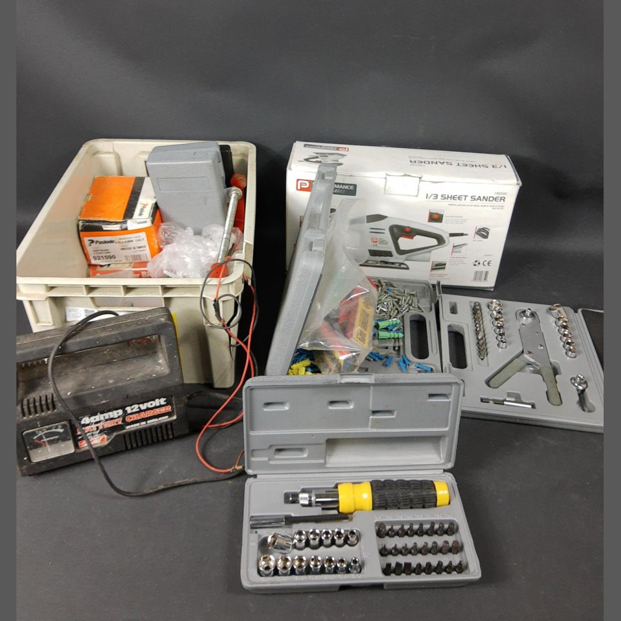 A box of handyman tools to include a 4 amp 12 volt battery charger, a 180W PERFORMANCE POWER 1/3 sheet sander (NLH1810S) engineered for B&Q, plus various socket sets, selection of rawl plugs