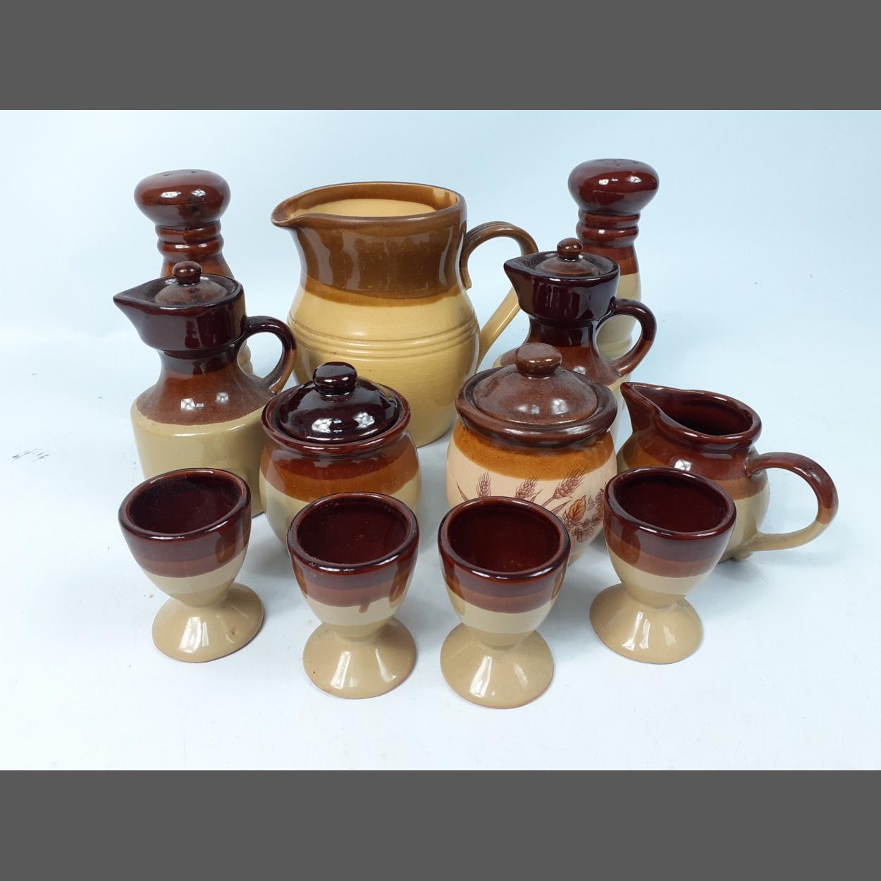 A small collection of kitchen STONEWARE to include vinegar and oil jugs, salt and pepper pots, 4 egg cups, 1 small jug, 2 lidded pots (11 cm tall) and a GRANVILLE jug (15cm tall)