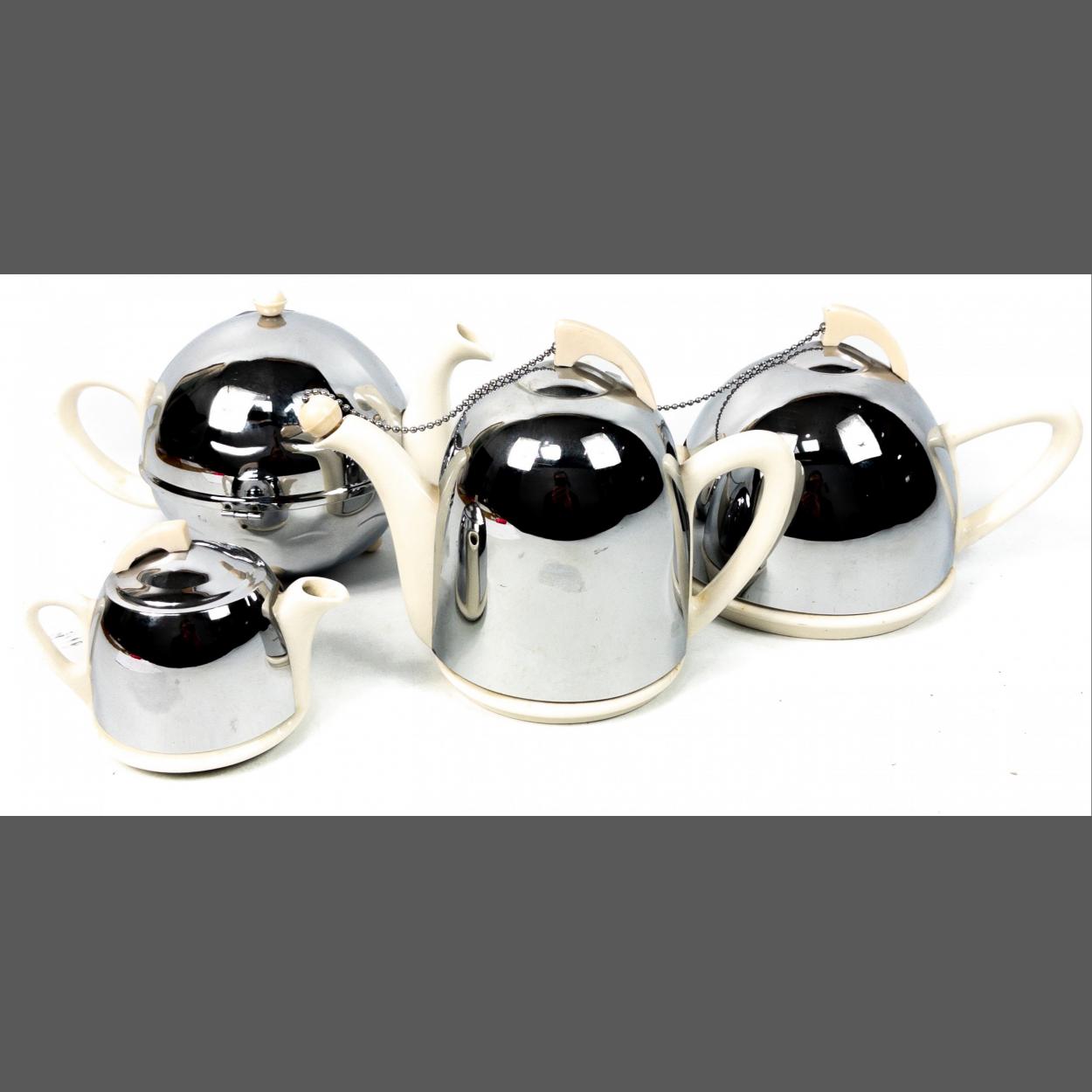 A stylish Art Deco three piece CELTIC BEEHIVE insulated tea set in the style of Heatmaster in very good order apart from a broken cork on pot also a similar teapot by the same maker on 3 small round feet