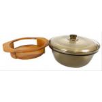 A large retro ARCOPAL glass casserole dish (28cm dia) with its own wooden base (32cm width), no chips or cracks