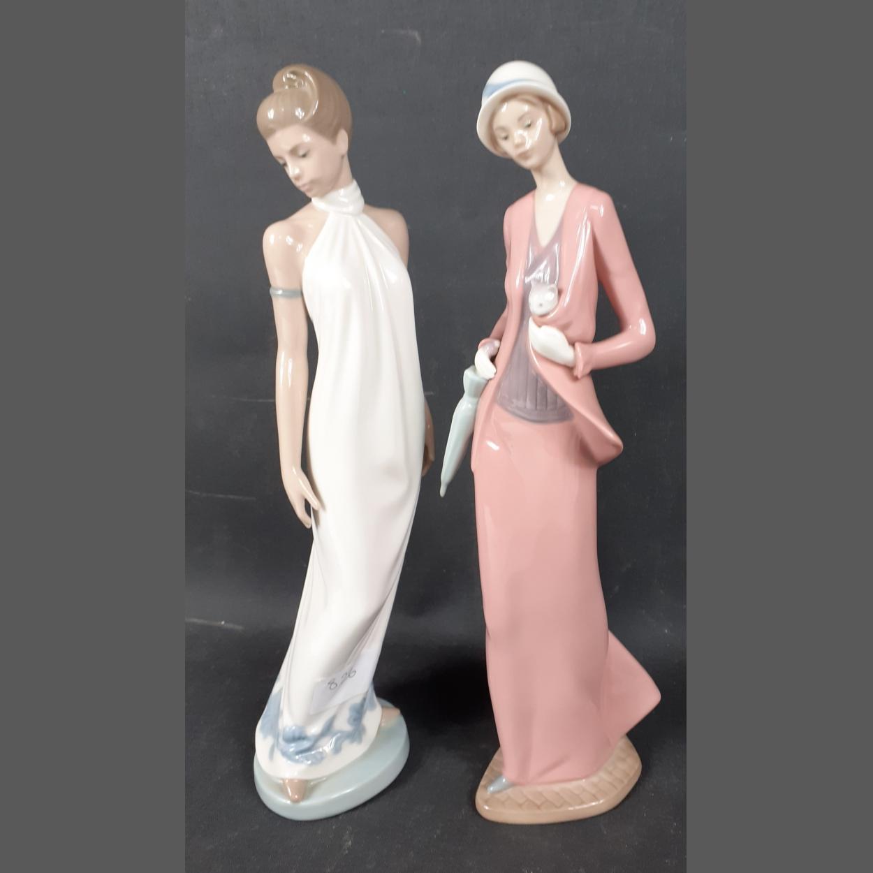 Two 31cm tall NAO by LLADRO figures of 1920s style FLAPPER GIRLS one in a white dress and the other dressed in pink carrying a kitten and an umbrella