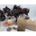 A VINTAGE mixed lot to include two large ceramic Carthorses with harness, unnamed but in good condition each standing 28cm approx, A Banjo barometer 50cm approx, a stoneware hot water bottle with stopper 26cm approx, a brass Gretna Green anvil in casket, a HOHNER Harmonica in box and others
