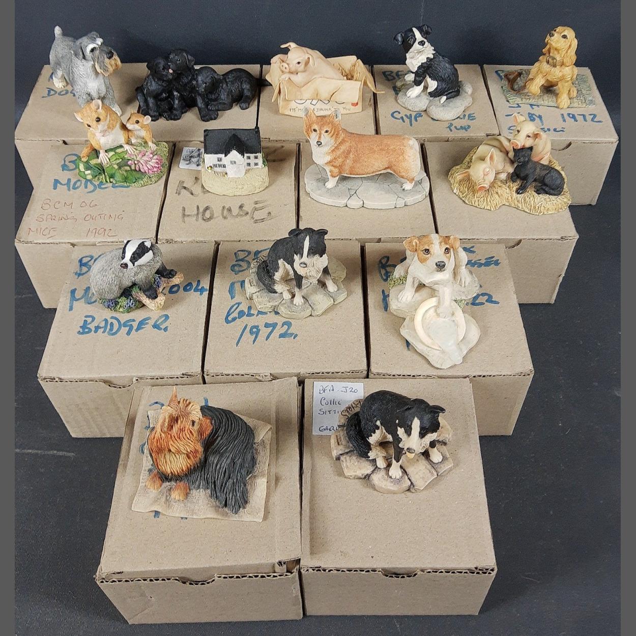 A superb collection of early Scotland Made BORDERS FINE ARTS mainly dog figures from 1970's onwards. Lot to include, James Herriot JH20 Jess Collie on plinth from 1974, James Herriot JH40 Piglets with cat, James Herriot JH26 Toby Spaniel from 1972, James Herriot JH22 Jack Russell, Corgi Dog from 1986, JH15 Gyp Collie pup, JH12 Nugent pig model from 1990, Ayres sitting Collie from 1987, Ayres Yorkie from 1993. Also incudes Airedale type terrier unmarked, Badger, Spring Outing Dormice from 1992, later 2002 China made A1446 Labrador pups ans small model house 'Hawick'.