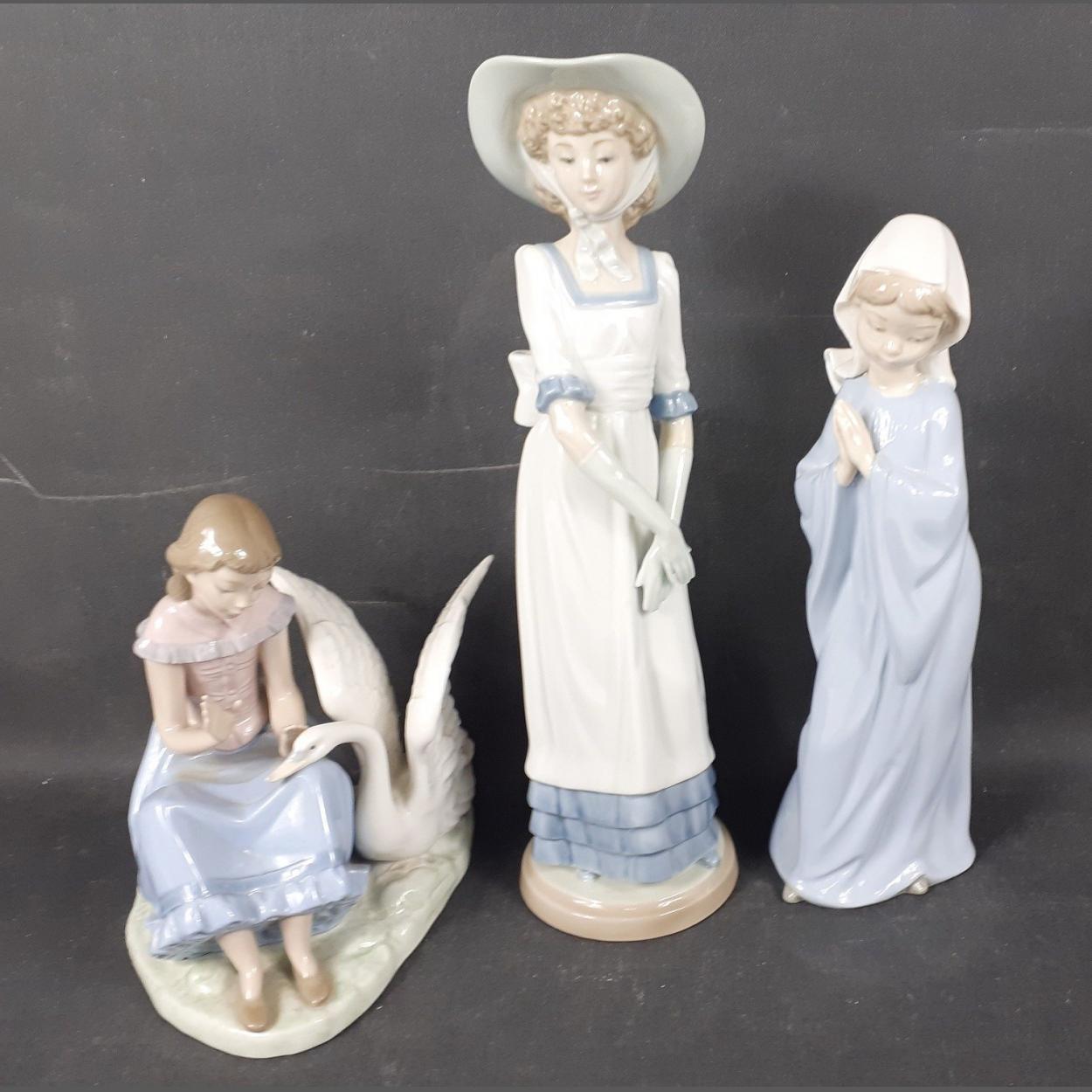Three NAO by LLADRO figurines including a girl with swan (19cm tall), a young girl praying (28cm tall) and a contemplative lady (32cm tall), no chips, cracks or visible damage