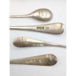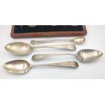 A boxed set of 6 silver coffee bean spoons hallmarked Birmingham 1929 by Docker & Burn, gross weight 36.5g plus 3 variously hallmarked silver teaspoons and a mustard spoon Birmingham 1911 weight 53.5g