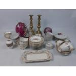 A mixed lot including a WEDGWOOD 'Clio' pin dish (10 cm dia) and small vase (10cm high), an OLD ROYAL tea service consisting of 6 cups, 6 saucers, 6 plates, a milk jug and sugar bowl, a crystal bell (17cm high), a multi-coloured glass swan (14cm tall), a Caithness-style bowl, an unusual glazed Italian flower vase (approx 22cm high), a part Japanese tea service including 4 cups, 6 saucers and 6 plates, 2 brass candlesticks (26cm tall) etc