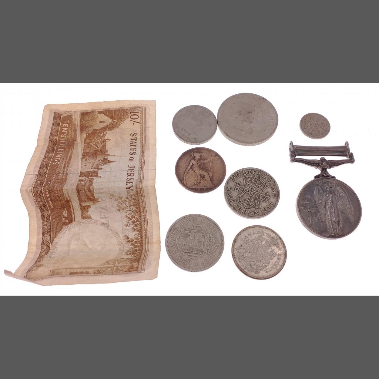 A small collection of coins and notes to include a STATES OF JERSEY 10/- note, a Churchill 1965 coin, a Canadian 50 cent coin, and a British Malaya general service medal with no ribbon awarded to 23162947 Pvt. T. Scott K.O.S.B.