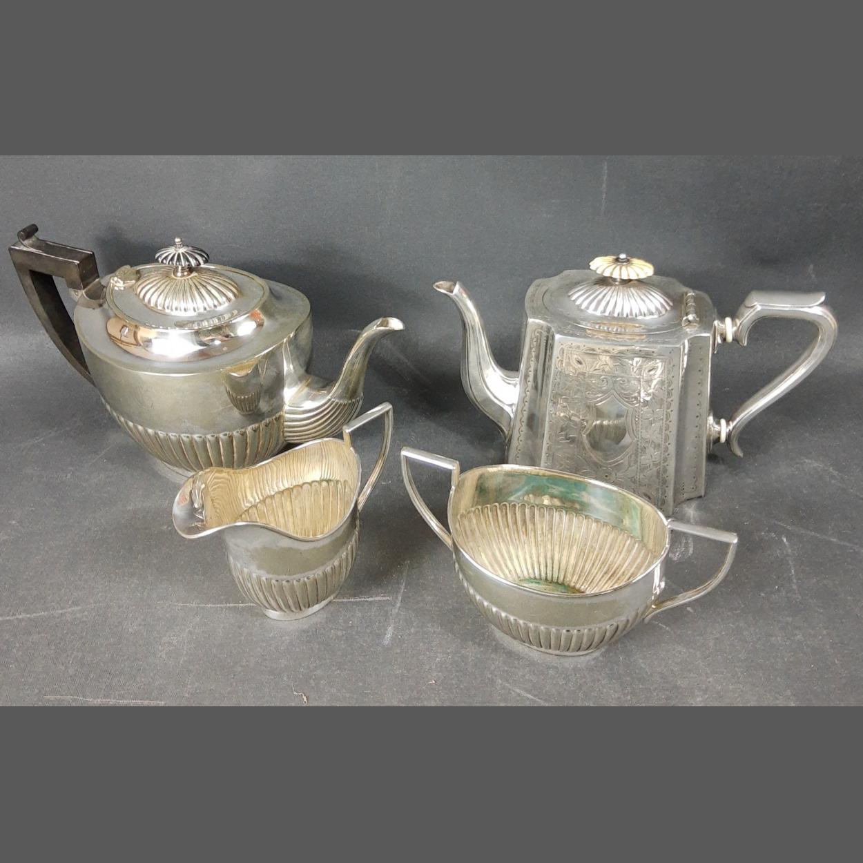 A silver-plated tea service comprising teapot, milk jug and twin-handled sugar bowl plus one other highly decorated teapot