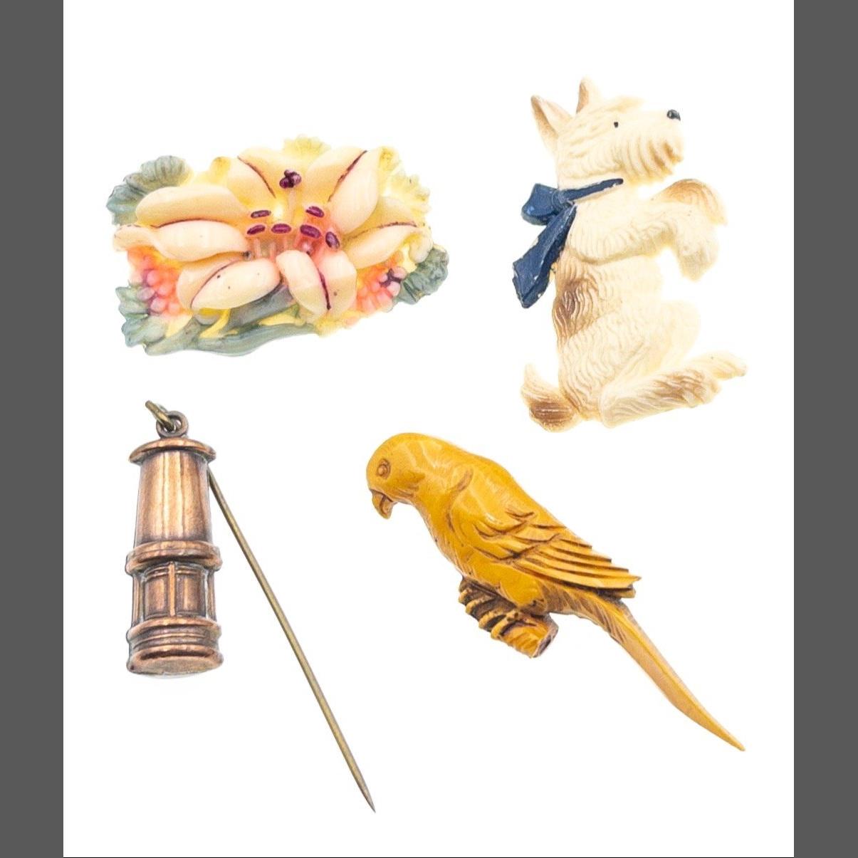 A WEE Collection of VINTAGE jewellery to include a WEST HIGHLAND Terrier brooch 4.5cm x 2.5cm , a brooch depicting a lily flower 3.5cm x 2cm, also a perched PARROT 5cm approx and lastly a MINERS DAVEY LAMP pin brooch made of copper 2.5cm length approx