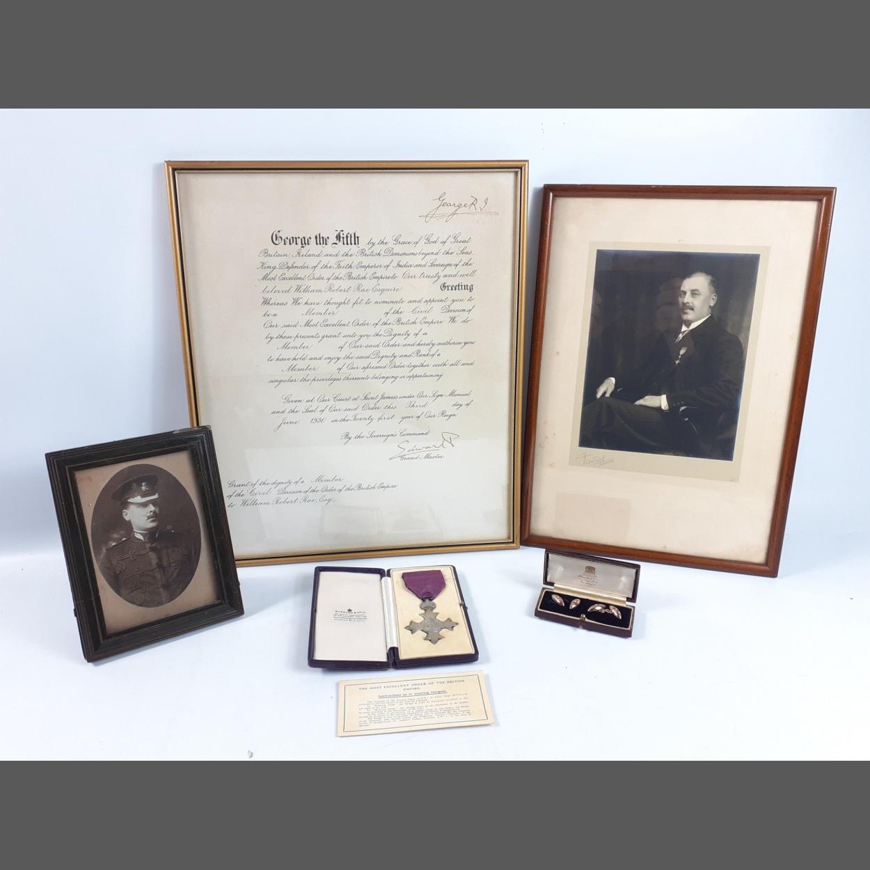 A boxed MBE with presentation certificate signed by TWO KINGS George V and his son the future Edward VIII in his capacity as Grand Master and Knight Grand Cross of the British Empire, very unusual indeed to find two kings signatures on one document. The recipient William Robert Rae was apparently security Superintendent and a confidant of King George V and along with the MBE was presented with a private gift of the gold and seed pearl cufflinks obtained from the best Scottish retailer Hamilton & Inches, jewellers by appointment to his Majesty as well as his Grandmother Queen Victoria. There are also two personal photographs, one showing him proudly wearing the actual medal.