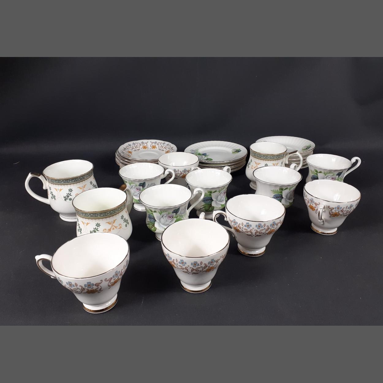 A part teaset by SUTHERLAND comprising 5 teacups and 6 saucers and another floral BONE CHINA part set with 6 saucers 5 teacups (one cup has a hairline crack) and 6 plates (15cm dia) plus 3 mugs by RANSAT