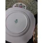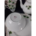A part service by COLCLOUGH with an ivy pattern to include 5 coffee cups, 3 teacups, 1 teapot, 2 plates (21cm) 2 cake plates, 2 soup bowls, and 8 further various sized bowls and a part ROYAL STAFFORDSHIRE tea set in a green and gilt pattern with floral centre to include 5 cups (3 damaged), 11 saucers, 12 side plates, 2 cake plates, 2 milk jugs, 2 sugar bowls