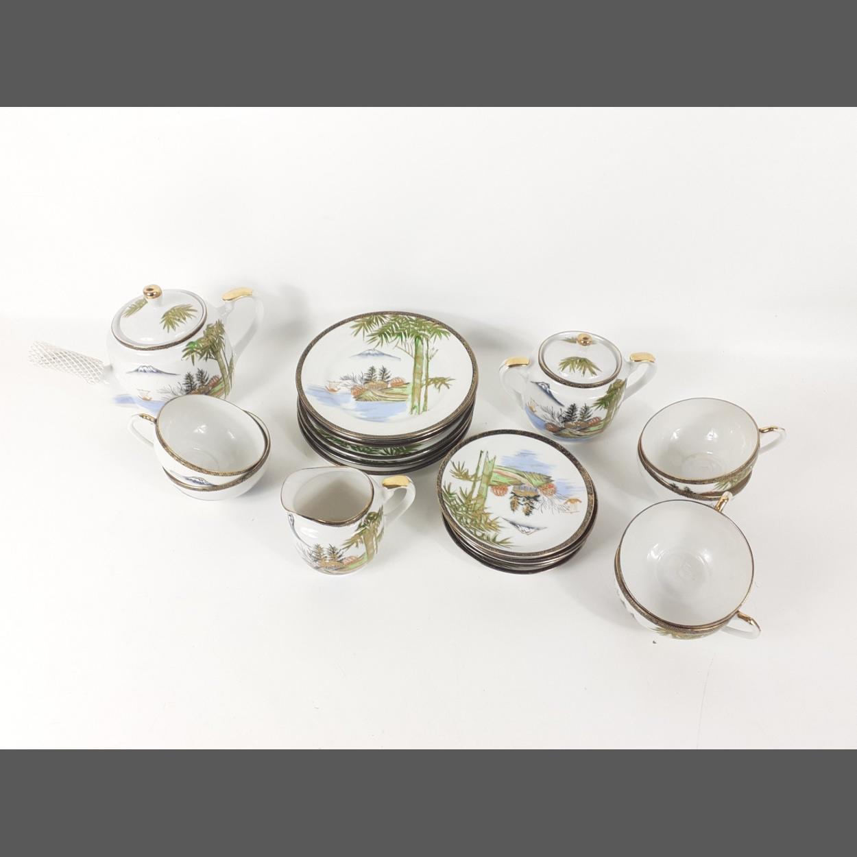A Japanese Tea Set with GEISHA imprint design on base of cups. 6 cups, saucers, plates. Tea pot and lid. Sugar jar and lid and a milk jug.