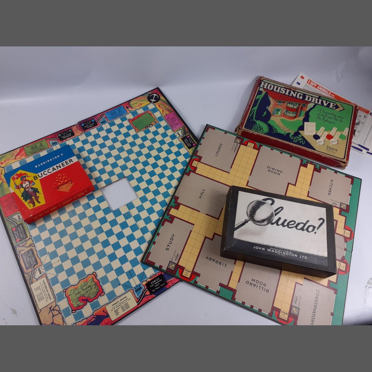 Vintage board games to include Waddington's BUCCANEER (1958), CLUEDO (1947), Pepys Series HOUSING DRIVE (1940s) plus 12 I-Spy game sheets from Burmah