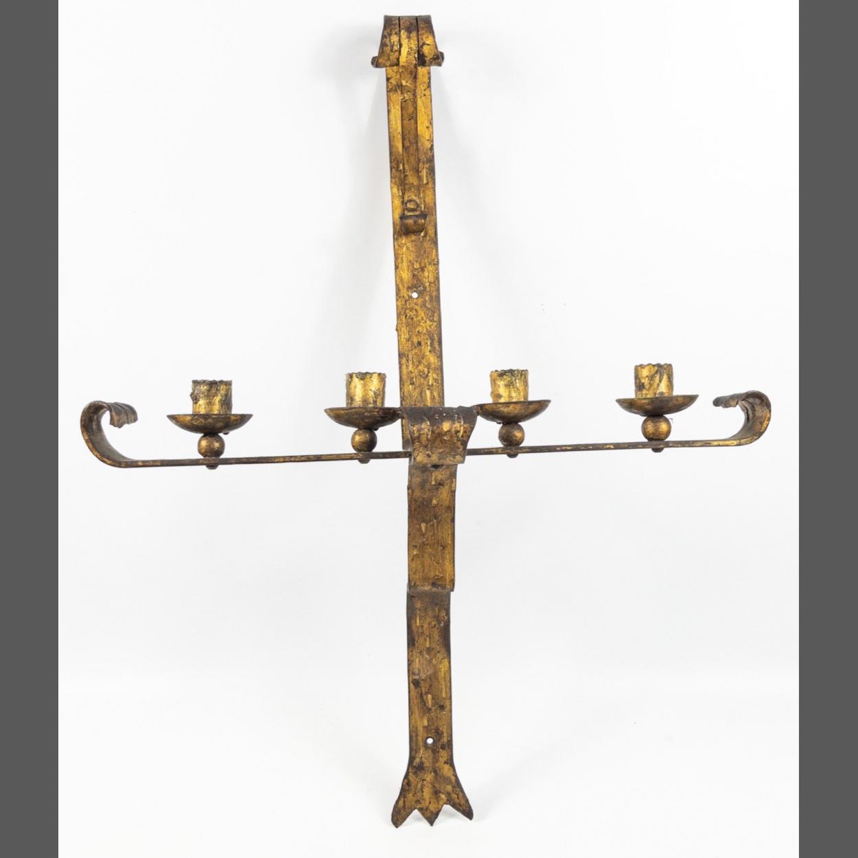 Impressive cast wall mounted gilt candle sconce with four holders. Very heavy and measures 70cm high by 50cm across approx.