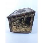 A brass metal covered wooden fireside wood box with repousse design on lid and three sides of a Tudor house and men on horses 46cmW x 30cmH 30cm D