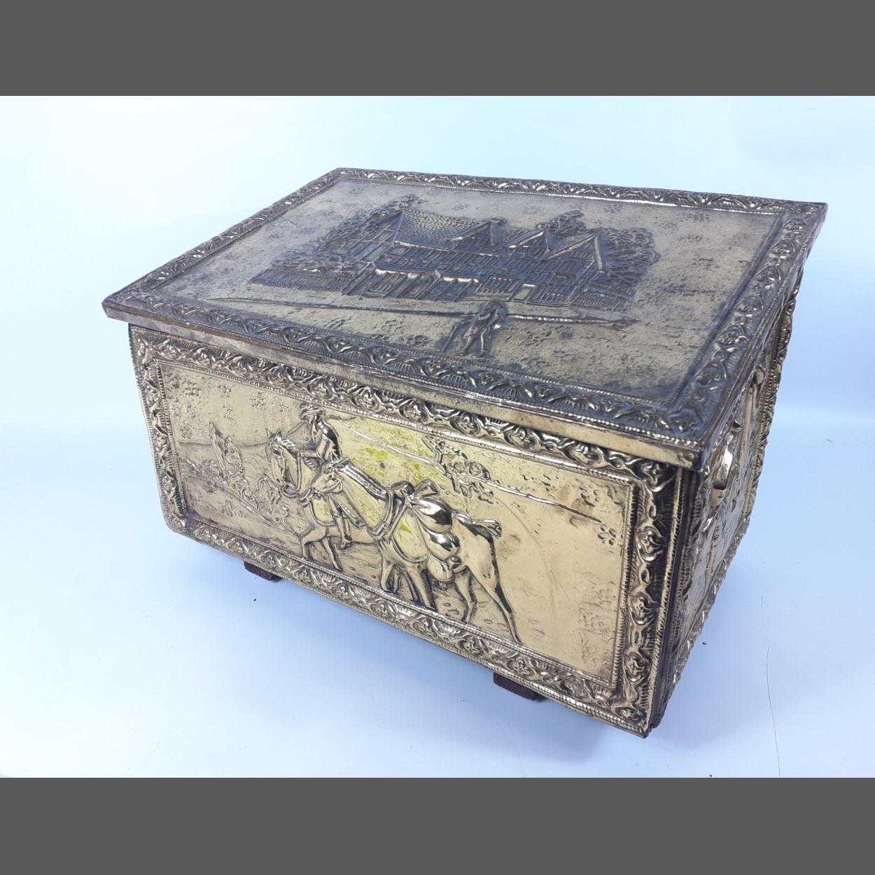 A brass metal covered wooden fireside wood box with repousse design on lid and three sides of a Tudor house and men on horses 46cmW x 30cmH 30cm D