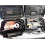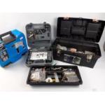 A substantial collection of handyman power tools with tool box, to include: Earlex HG2000 heat gun in case with accessories, MacAllister 600w impact drill in case,a challenge extreme MJ5654 jigsaw, Black and Decker cyclonic sander in case and a tool box with mainly small ironmongery