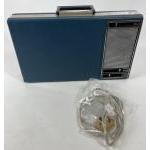 A vintage PHILIPS briefcase-style portable record player with a dark blue cover, still has adapter for single records with a hole in the middle and power cable