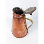A large conical shaped vintage copper jug with brass handle. Welded base. Stands 27cm high approx and a base diameter of 18cm