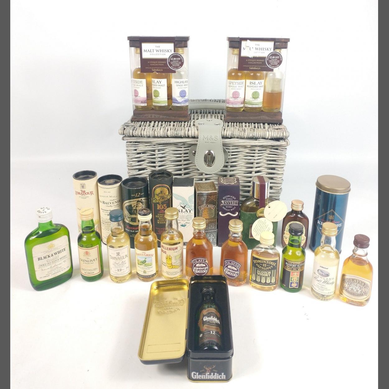 A handy-sized M&S wicker basket (30x26x20cm) with a full complement of 50ml whisky miniatures to include BLACK &WHITE 70% proof, 3 1/3 fl oz, GLENFARCLAS 60%, the BALVENIE Founder's Reserve 40%, BUNNAHABHAIN Single Islay, GLENFIDDICH Special Reserve (in a tin), the EDRADOUR single malt, TOMINTOUL 12 yr old GLENLIVET, TAMNAVULIN Speyside single malt, the FAMOUS GROUSE, PASSPORT SCOTCH by William Longmore & Co, MILLENIUM (sic) BUG, CHIVAS REGAL, 3 bottles of GLAYVA (1 labelled Edinburgh Tattoo), and from M&S KENMORE blend, a HIGHLAND MALT whisky, ISLAY single malt, INVEREY single malt, SCOTCH WHISKY hip flask (10cl), plus 2 selection packs from the SAINSBURY MALT WHISKY COLLECTION - Speyside, Islay and Highland Malt (some evaporation of the Highland Malt) The item is sold as described and we do not accept liability for the state of the closure or the taste of the contents.