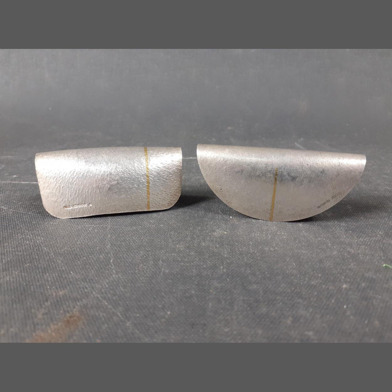 Two mis-matched sterling silver napkin holders by M.E.K. Both with full EDINBURGH silver marks, one dated 2002 and the other 2003. Interesting hammered finish with unusual thin gold strip. Gross weight 69g approx