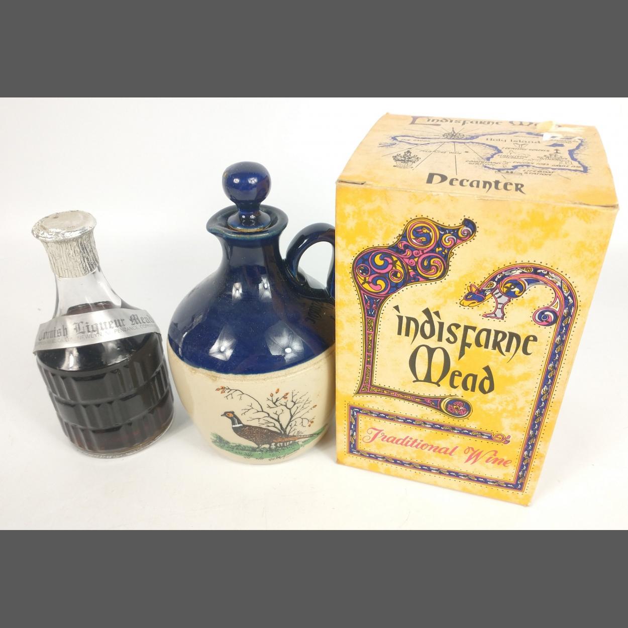 LINDISFARNE MEAD - a boxed decanter with pheasant design plus a 17.5cl bottle of CORNISH LIQUEUR MEAD 17% vol. The item is sold as described and we do not accept liability for the state of the closure or the taste of the contents.