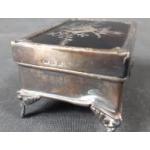Two Sterling Silver Jewellery / Ring / Trinket boxes. The first Heart shaped with a satin interior hallmarked Chester 1920 maker C&S measures 6cm across approx and has slight crease to front meaning the front foot is bent, weight 54g approx. The second is rectangular with an inlaid turtle shell top and carries hallmarks for Birmingham 1907, Maker W.C. measures 7cm across approx and weighs 71g approx. Very attractive lot.