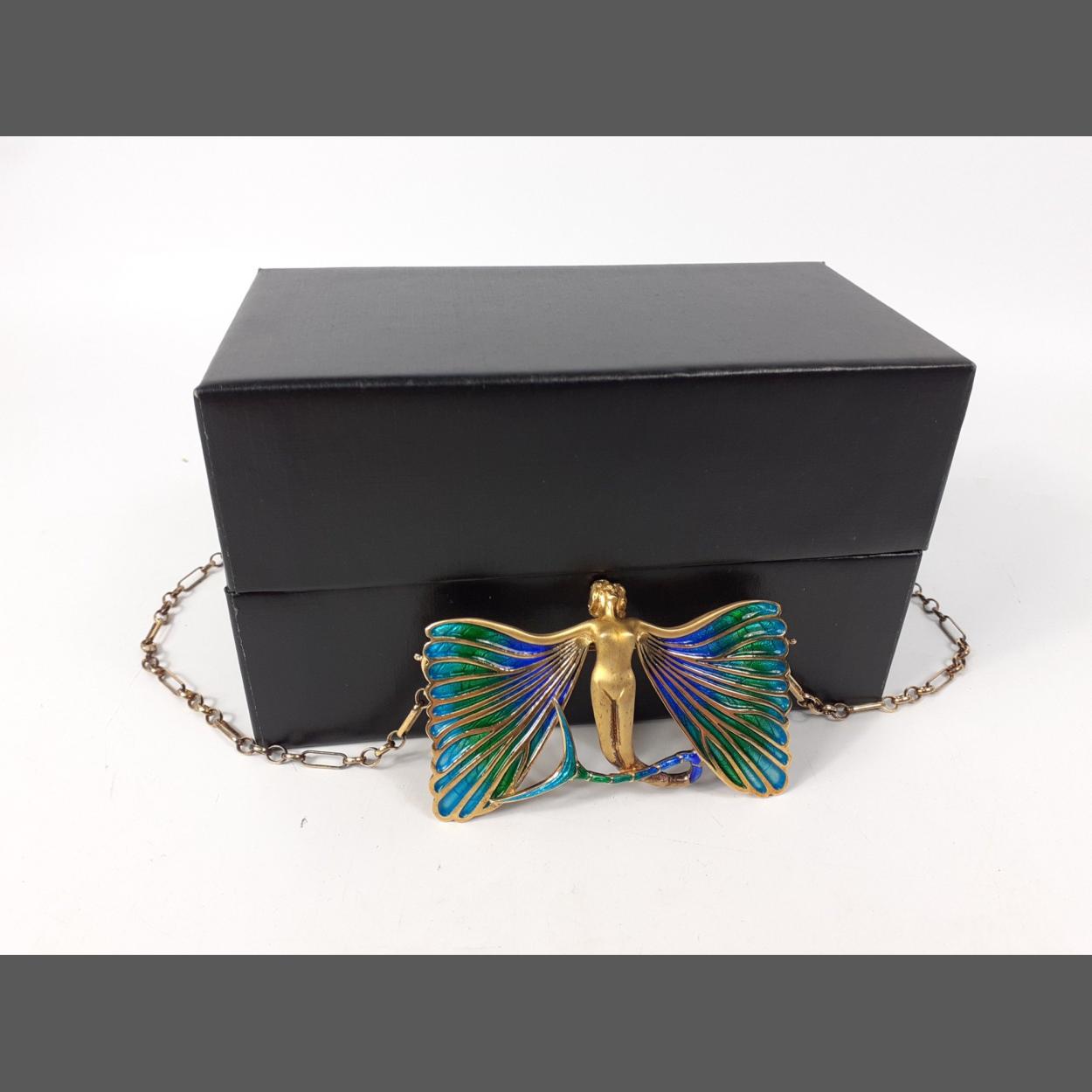 OOOO LA LA - A LALIQUE inspired emulation brooch / pendant in silver gilt setting on a 925 stamped chain made bespoke by ALCHEMIA GALLERY of Edinburgh Scotland. Vitreous enamel wings and tail in stunning colours on this flying nymphette. Total weight 52g approx. 75mm across from wing tip to wing tip. In excellent undamaged condition but would benefit from a gentle clean.