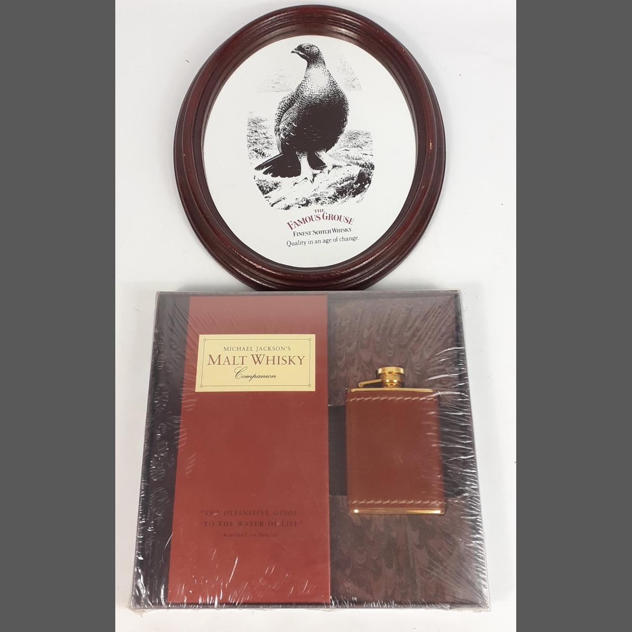 MICHAEL JACKSON'S Malt Whisky Companion published by DK in 1998. Contains the book packaged with a hip flask. Lot also includes an oval FAMOUS GROUSE mirror measuring 28 x 21cm approx