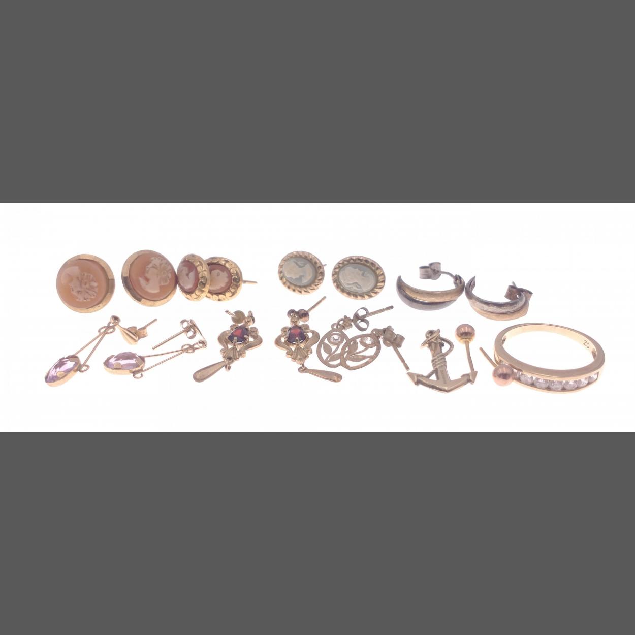 A 375 stamped yellow gold anchor charm weight 0.50g approx with lots of unmarked 'yellow metal' earrings mainly gross weight 12.17g approx