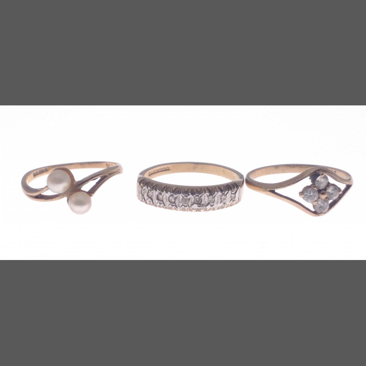 A trio collection of 375 stamped yellow gold dress rings to include a twin pearl ring size M, a half eternity style ring with white stones size N and a white stone floral centred white stones ring size M - total gross weight of the 3 rings 4.60g approx