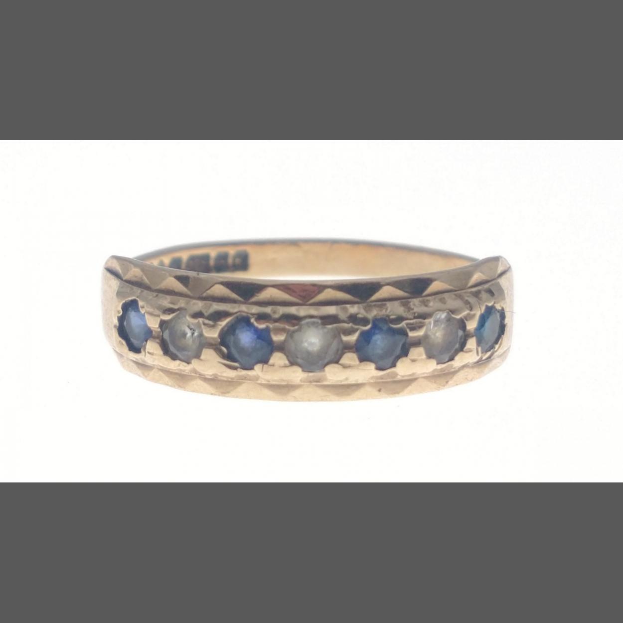 A 375 stamped yellow gold half eternity style ring with four blue sapphires and three clear stones set, ring size N gross weight 1.97g approx